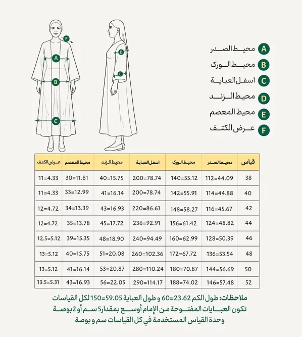 للحصول على مقاس العباية المثالي، من الضروري أخذ قياسات الجسم بدقة. إليك الخطوات الأساسية: