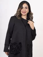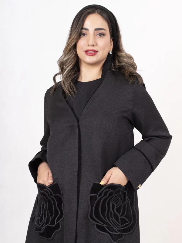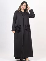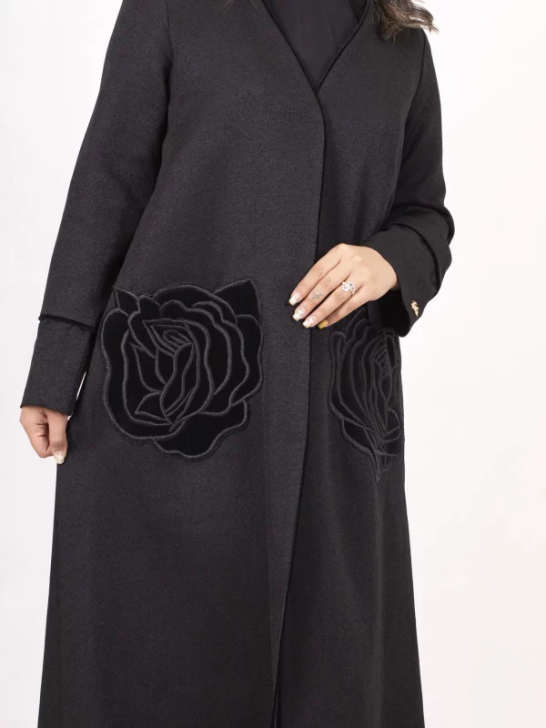 عباءة أزهار من قماش الكتان اللامع، مزينة بتطريز ورود من المخمل، مع حواف مخملية تضيف لمسة جميلة وأنيقة. خيار رائع للمناسبات الخاصة، حيث يجمع بين البساطة والجمال.