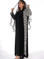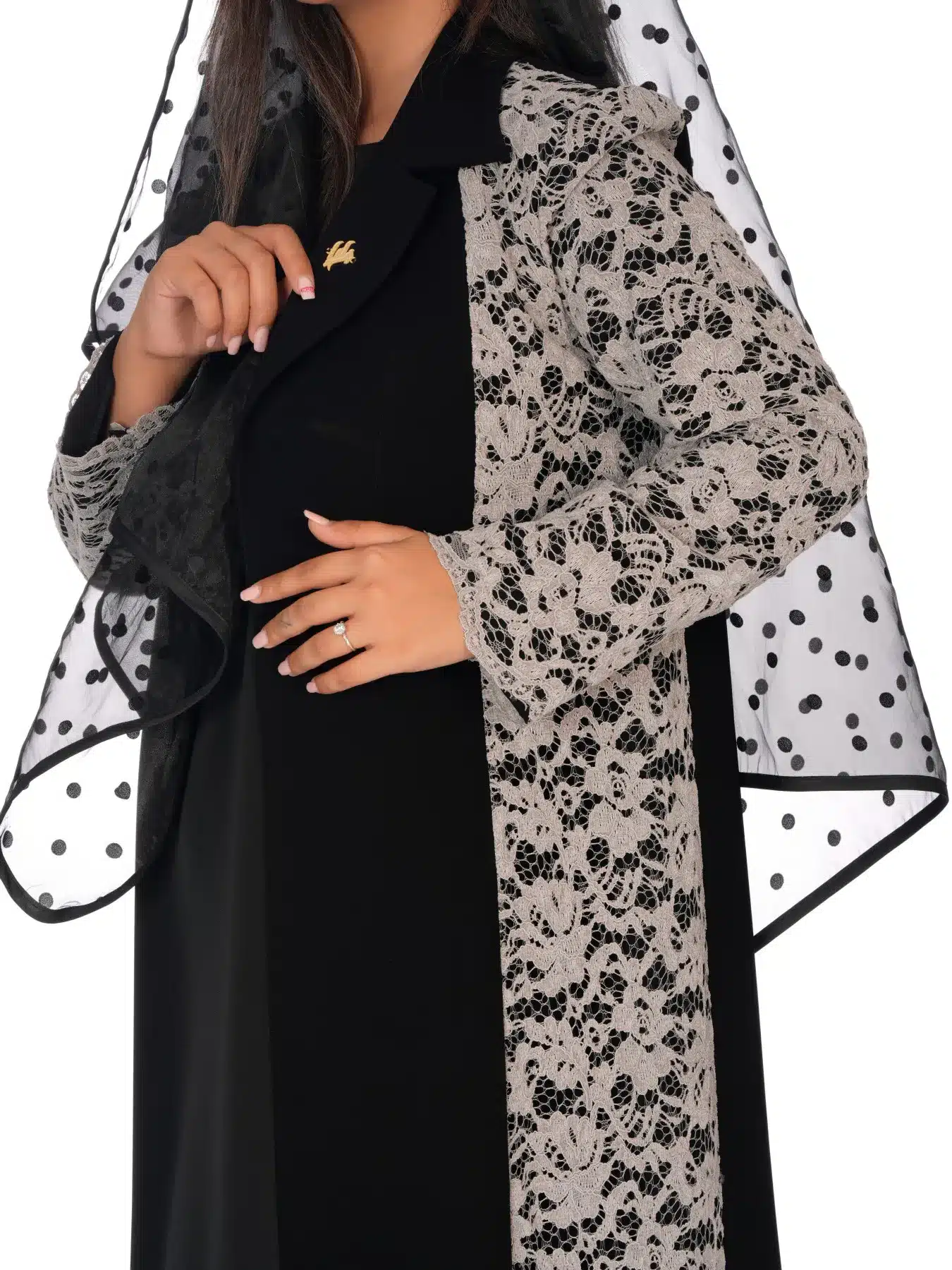 عباية هانا من قماش الكريب والدانتيل، مزينة بدانتيل رمادي عالي الجودة ليضفي عليها لمسة أنيقة وراقية. تصميمها المستقيم يمنحها طابعًا كلاسيكيًا وجذابًا، مما يجعلها خيارًا مثاليًا للمناسبات الرسمية والخاصة. تجمع هذه العباية بين الراحة والفخامة، مقدمة إطلالة أنيقة وعصرية بكل رقي.