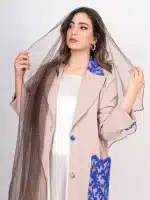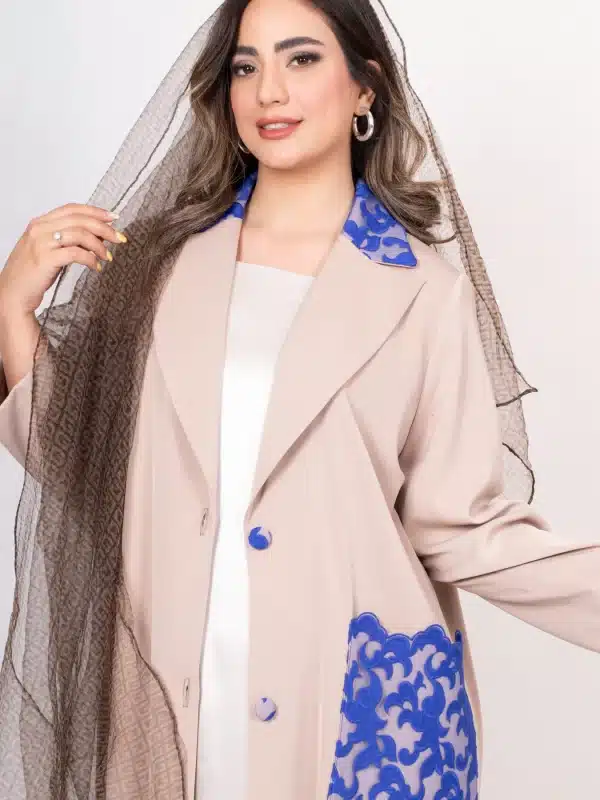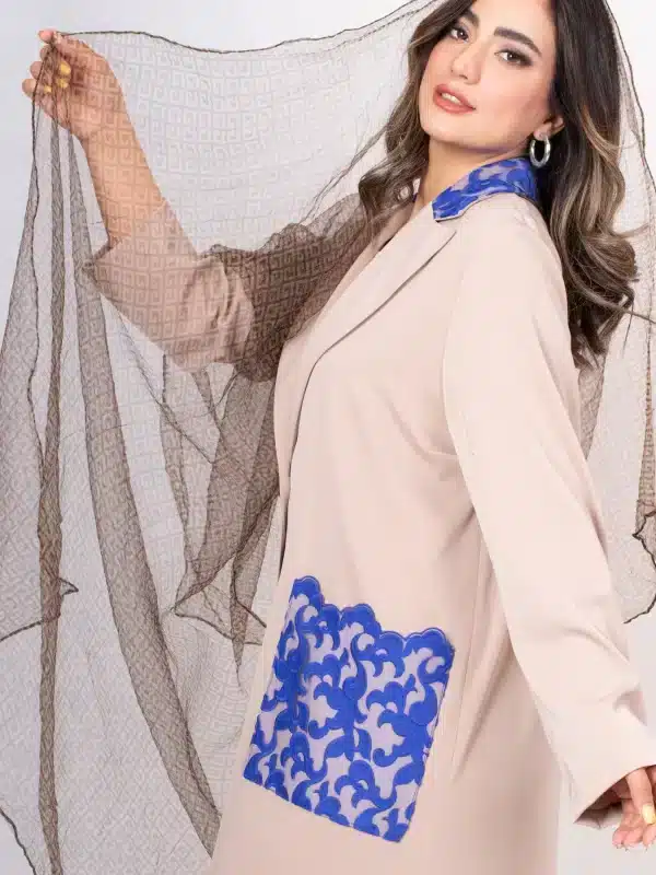 عباية هانية مصنوعة من قماش الكريب الخفيف والدانتيل، حيث يأتي الكريب بلون الكريم الناعم، مزين بدانتيل أزرق يمنحها مظهرًا جذابًا وملفتًا للنظر. هذا التناسق بين الألوان يضفي عليها أناقة خاصة. كما تحتوي العباية على جيب أمامي مزين بالدانتيل ليضيف لمسة راقية إلى التصميم.