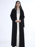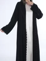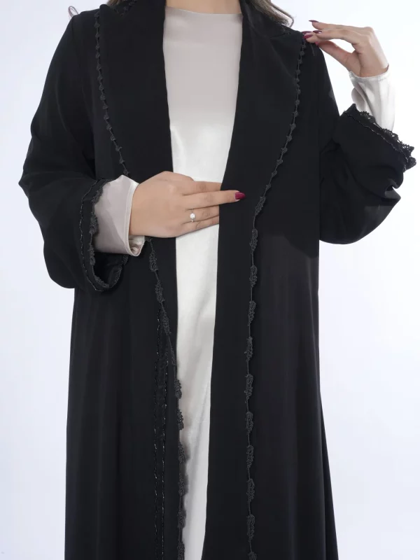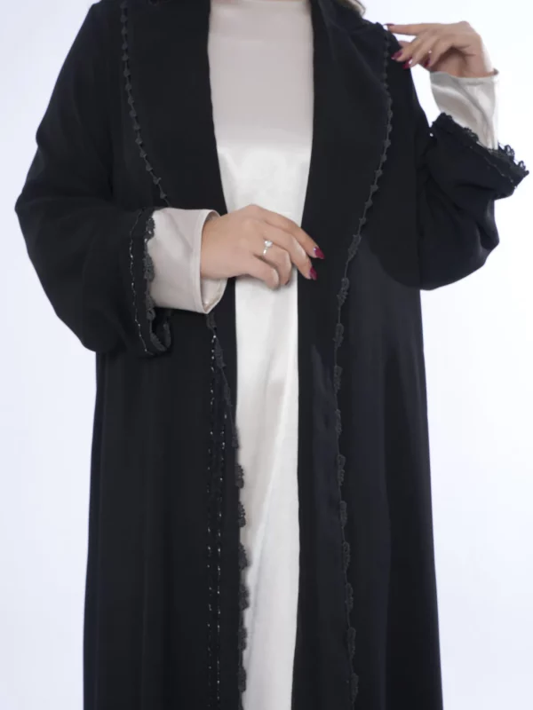 مقدمة العبا مزينة يدوياً بتقنية خاصة اسمها “تاركشي”، مع تطريز دقيق بحبات المنجوق على الجوانب.