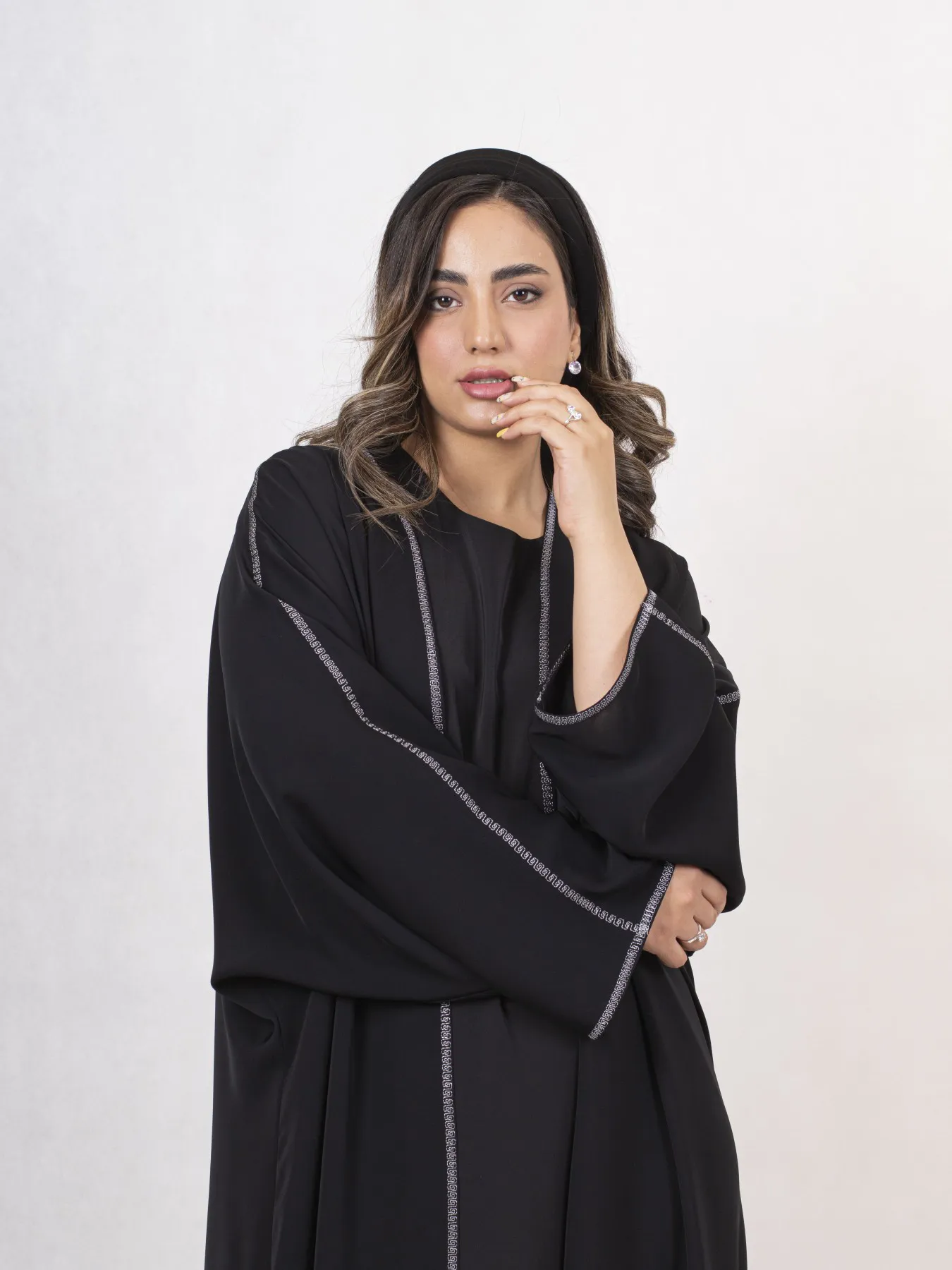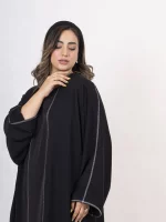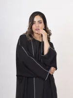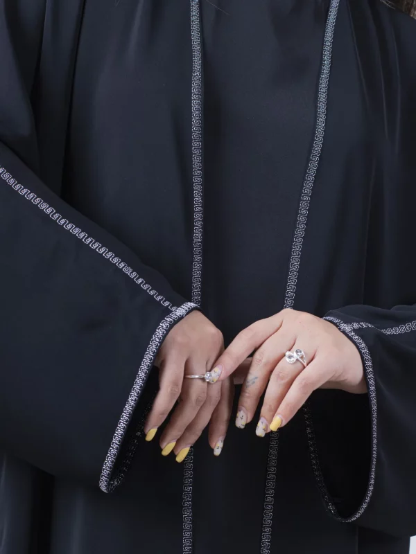 تأتي عباية مهتاب بقصّة مستقيمة تمنح الجسم تناسقاً محسوباً، وهي قصّة تعتمد عليها الكثير من النساء العربيات ممن يفضلن العبايات الكلاسيكية ذات الطابع المحافظ والعملي. اعتماد الفتحة الأمامية يجعلها مناسبة للاستخدام اليومي أو التنسيق مع قطع بسيطة، الأمر الذي يمنح المرأة مساحة أكبر للحركة وللتعبير عن ذوقها الشخصي. كما أن ياقة الجاكيت تضيف لمسة رصينة ترفع من قيمة الإطلالة دون مبالغة، وهو تماماً ما تبحث عنه من تختار عبايات راقية ذات حضور هادئ. عند قراءة هذه التفاصيل، تشعر المرأة أن هذه العباية صُممت لترافقها في مواقف متعددة، من العمل إلى الزيارات الرسمية.