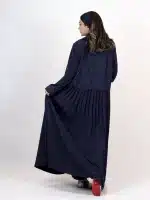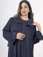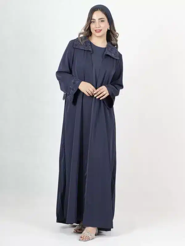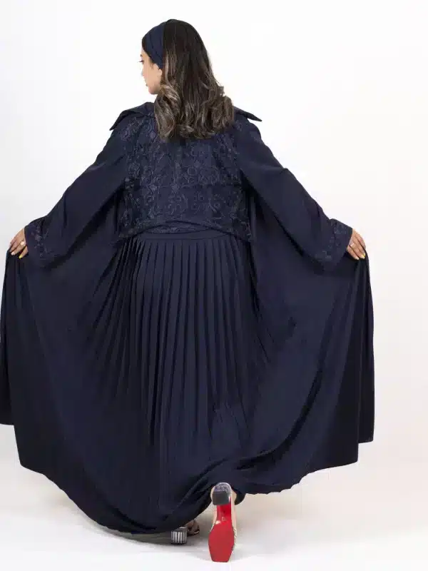 العباءة تأتي بياقة جاكيت تمنحها مظهرًا عصريًا، بينما تزدان الأجزاء العليا والأكمام بتفاصيل دانتيل تضفي لمسة من الجمال والرقة. طول العباءة بين 140-150 سم يجعلها تغطي الجسم بشكل كامل، مما يضيف إليها مظهرًا كلاسيكيًا مناسبًا للمناسبات الرسمية وغير الرسمية على حد سواء.