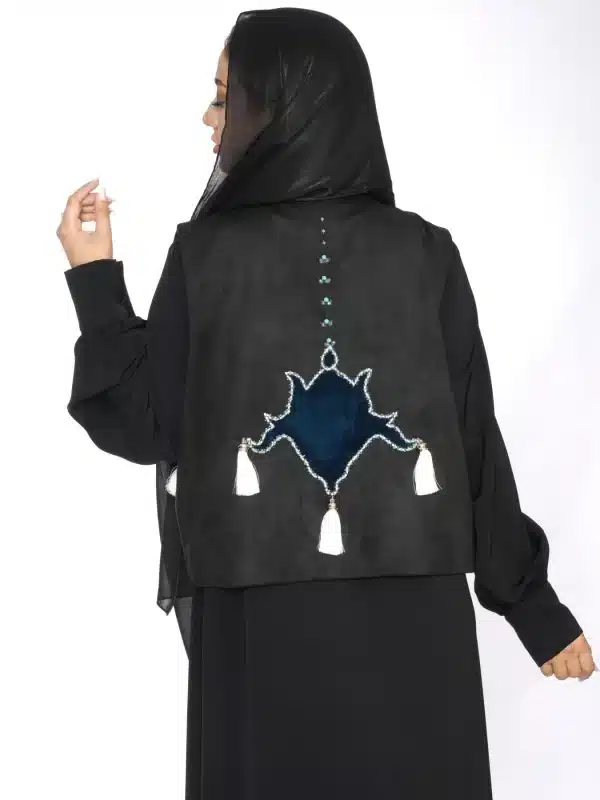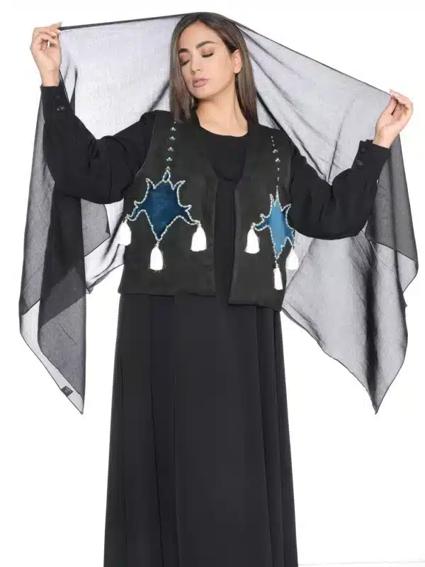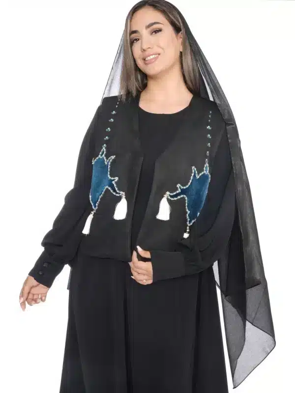 الجزء العلوي من هذا الرداء لة تصميم خاص يبدو كأنة جاكيت منفصل عن العباية. تم تزيين الأكمام والجيوب بتطريز السرمة الدقيق وحبيبات الجواهر لإضافة لمسة من الفخامة مما يزيد من روعة وجمال الثوب. الجزء السفلي من الرداء مصنوع من قماش الكريب، مما يعطي الثوب نعومة وثباتًا خاصين. تم ربط هاتين القطعتين مع بعضهما البعض بخبرة، يبدو للوهلة الأولي أنهما منفصلان، لكن في الحقيقة هما متكاملان، هذا التصميم الفريد يجعل رداء فينوس خيارًا مثاليًا للمناسبات والإحتفالات الخاصّة.