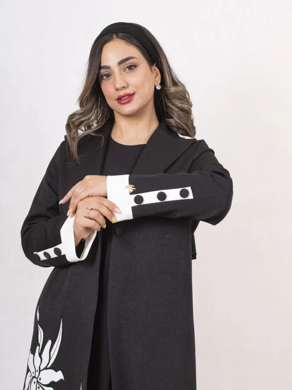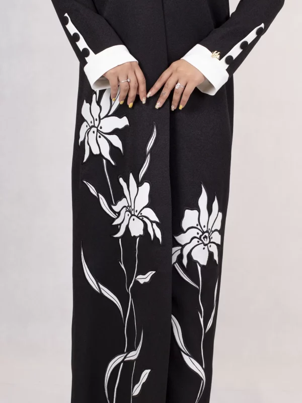 تتميز عباءة زنبق بتطريز دقيق على الأكمام وأسفل العباءة، مما يضفي عليها لمسة من الأناقة والتميز. تطريز الأزهار البيضاء يضيف لمسة جميلة على التصميم البسيط، مما يجعل هذه العباءة خيارًا مثاليًا للمناسبات الخاصة. بالإضافة إلى ذلك، فإن العباءة غير شفافة تمامًا، مما يضمن لكِ الراحة والخصوصية.