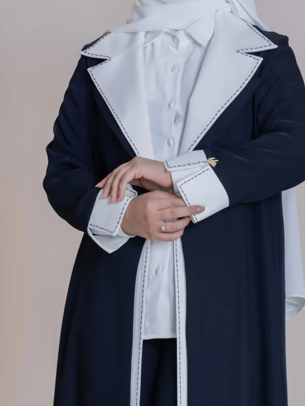 مزيج اللونين الكحلي والأبيض، بالإضافة إلى المظهر الأنيق والكلاسيكي، يعطي مظهراً جديدًا وجذاباً. هذه العباءة، مع الخياطة المحترفة والتطريز الدقيق، تقدم مزيجاً فريداً من الراحة والجمال.