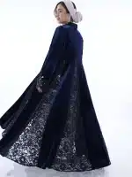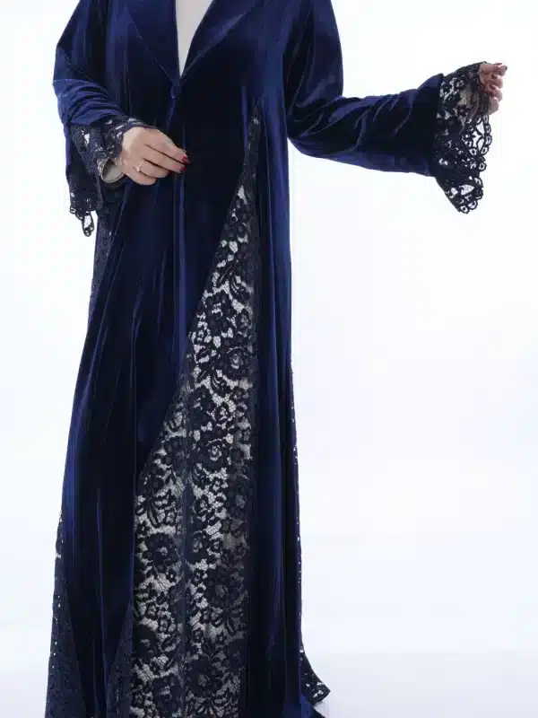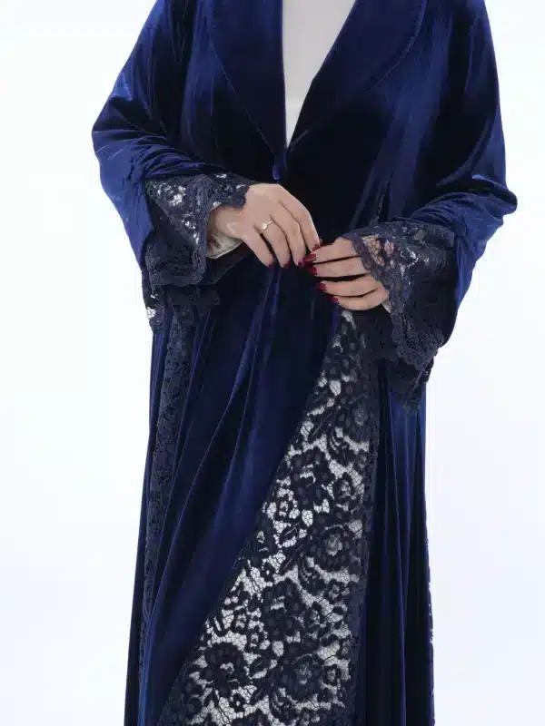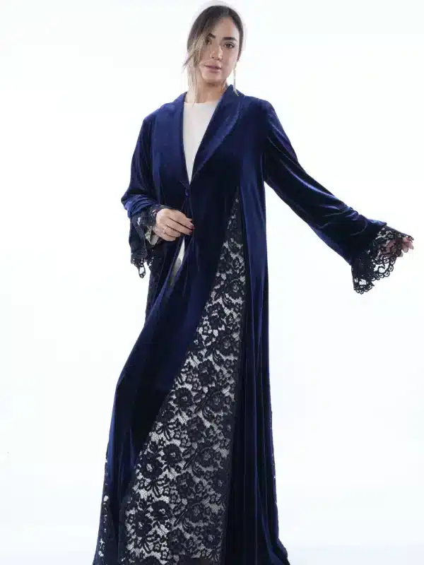 عباية اللوتس الزرقاء بمزيجها من المخمل الفاخر الدانتيل الجبور، هي اختيار مميّز للمرأة الراقية.
