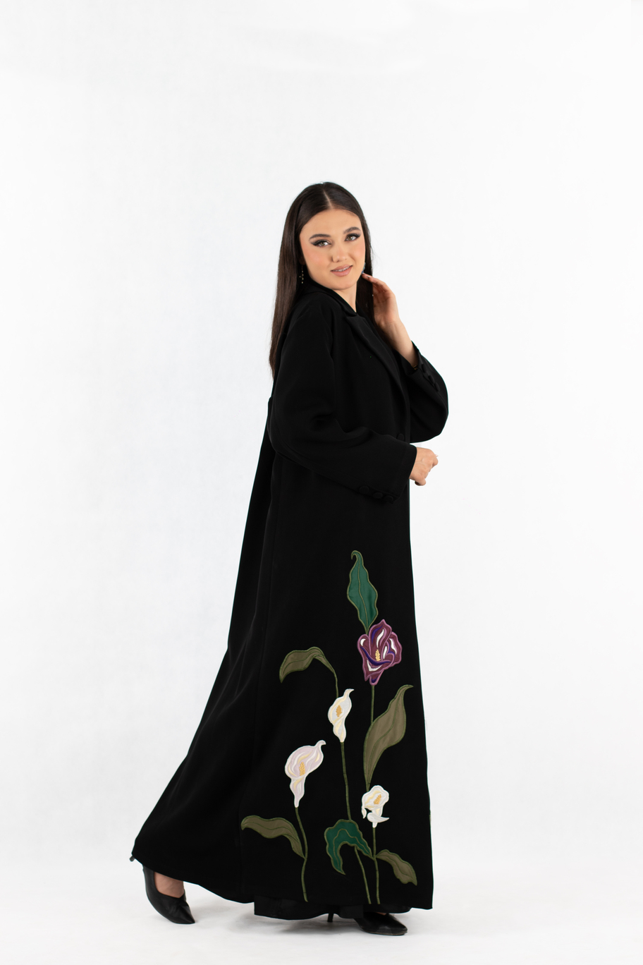 تصميم العباية طويل بالكامل ويمتد بين 140 و150 سم، ليعكس إطلالة ملكية تليق بكل امرأة تبحث عن حضور قوي وجذّاب. تأتي بقصة مستقيمة ناعمة تُبرز أناقة القوام دون مبالغة، بينما تضيف الياقة الجاكيت لمسة رسمية فاخرة تعكس شخصية راقية وواثقة. بما أنها مفتوحة من الأمام، فهي تمنحك مساحة أكبر للإبداع في تنسيق الإطلالة مع فساتين السهرة أو الأطقم العملية.