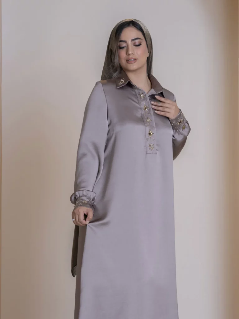 Ibtisam Abaya in dewy fabric, embroidered with silver jewels, kimono cut and free-size, suitable for parties and events.