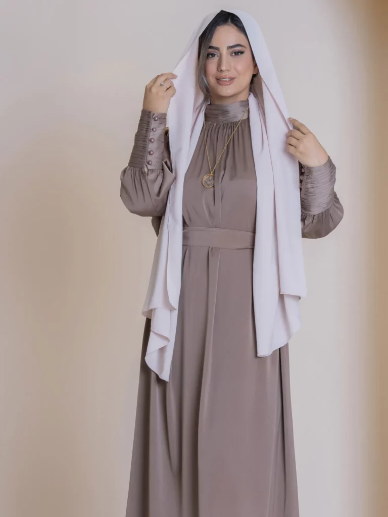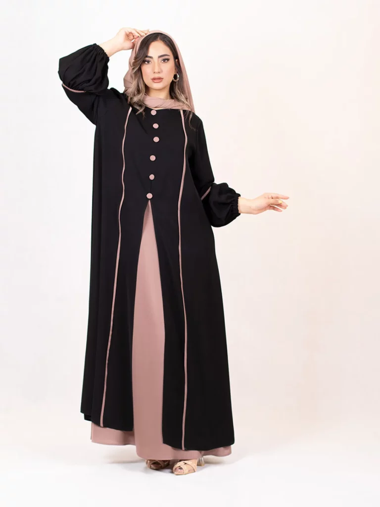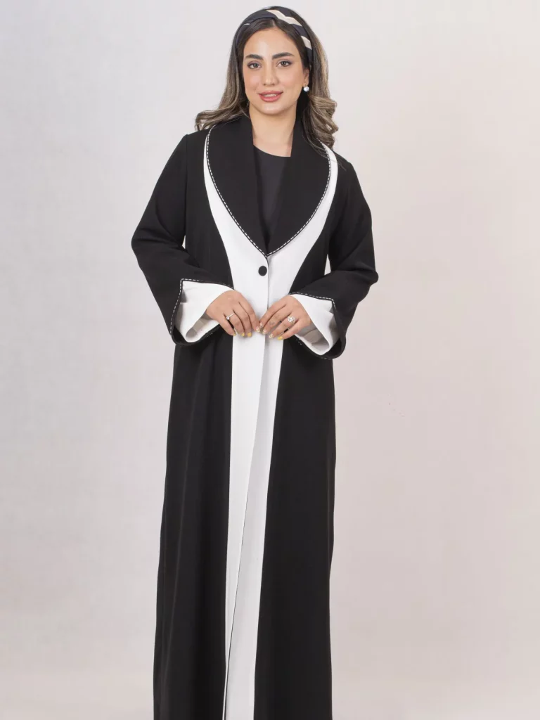 The "Elham" abaya is made of crepe fabric, in coordinating colors of white, cream, and black, with an elegant and comfortable design.