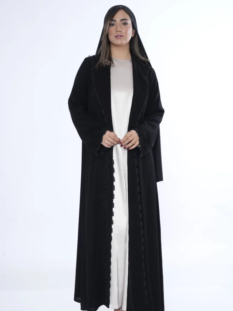 The Atiyeh Abaya, a combination of corrugated crepe and velvet, is an elegant and unique design that gives you a special look.