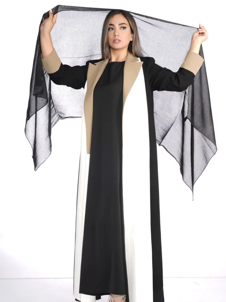 The “Hamida” Abaya is made of an elegant blend of black and white crepe fabric in a unique and sophisticated